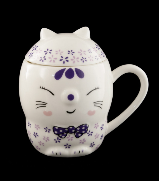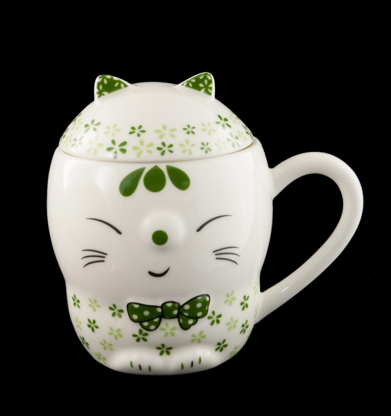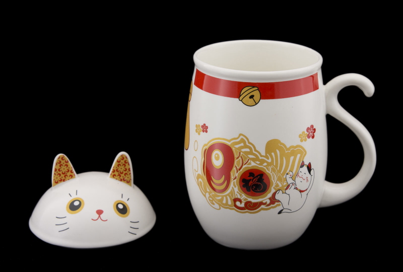 Tasse Chat Japonais Maneki Neko Mug porcelaine avec couvercle Lucky Cat 40622